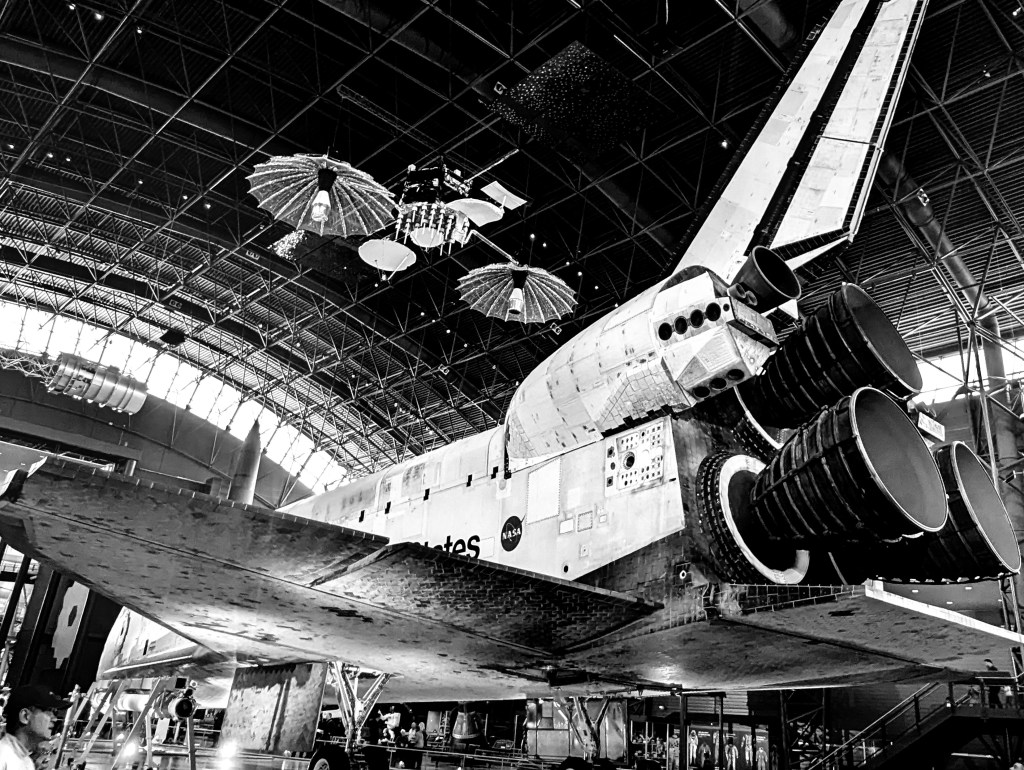 In the black-and-white close-up, I was struck by the “scars” on the fuselage. We often see the shuttle in polished NASA press photos, but up close, you see the scorching, the weathered tiles, and the grit of actual space travel. Stripping away the color forces you to focus on the geometry—the honeycomb of the ceiling and the massive, bell-shaped nozzles that pushed humans into orbit. It transforms a machine into a work of industrial art.