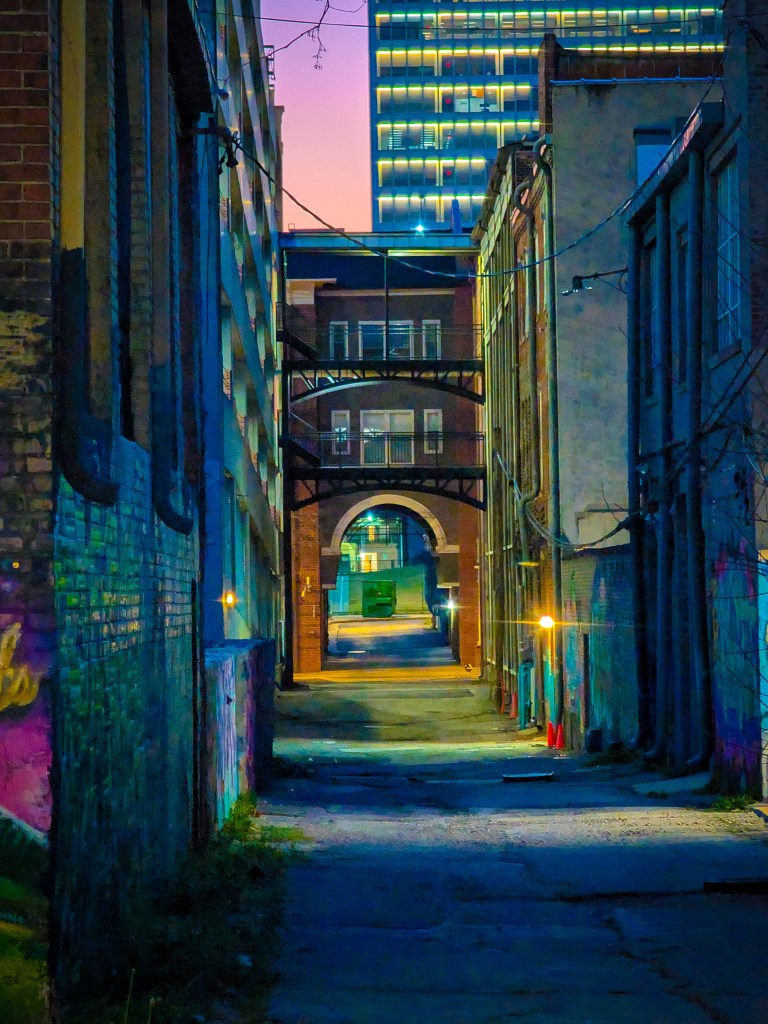 As we waited for our Lyft back to the hotel and the day turned to night, the atmosphere shifted from “travel day” to “Memphis magic.” I caught the sunset dipping into the alley, washing the scene in a majesty of colors. I snapped a quick photo that ended up being one of my favorites of the entire trip.