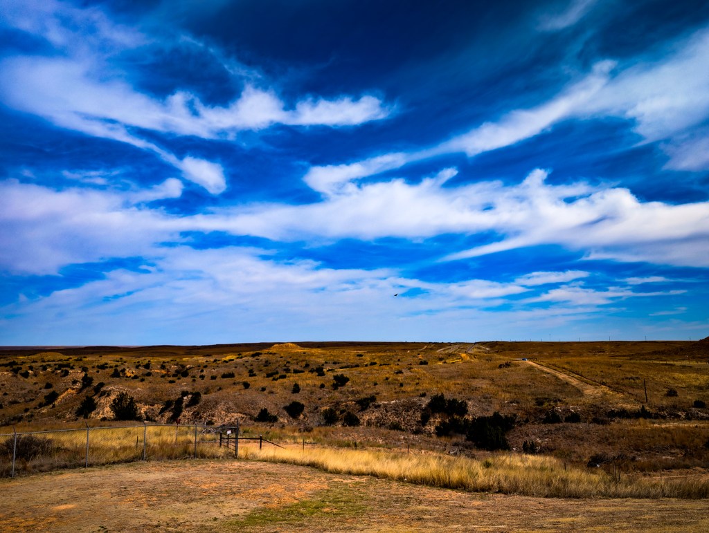 Without any peaks to break up the view, the eye is drawn to the subtle textures of the earth and the deep, saturated blues of the atmosphere. The fence line in the foreground gives a great sense of perspective and scale—it’s just you, the grass, and the long road ahead.