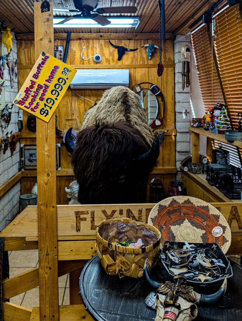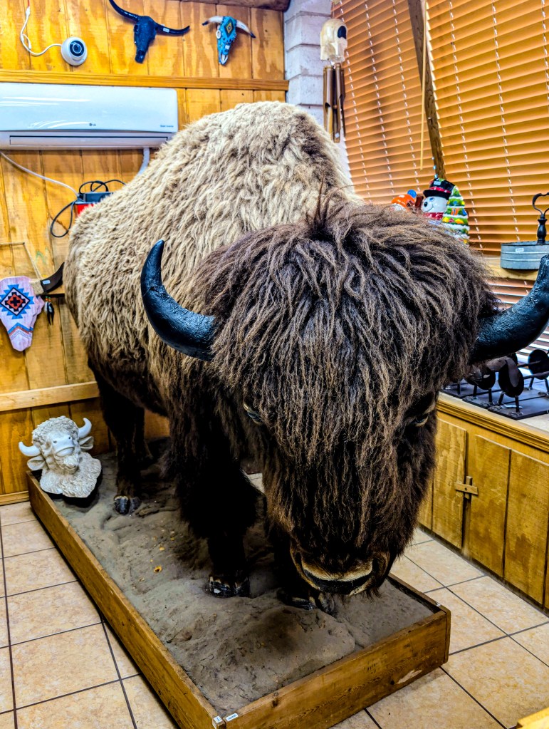 Right there, among the keychains, cowboy hats, and postcards, was a full-size, professionally stuffed American Bison named Willie. Yes, a taxidermy buffalo was for sale. It was even on wheels.