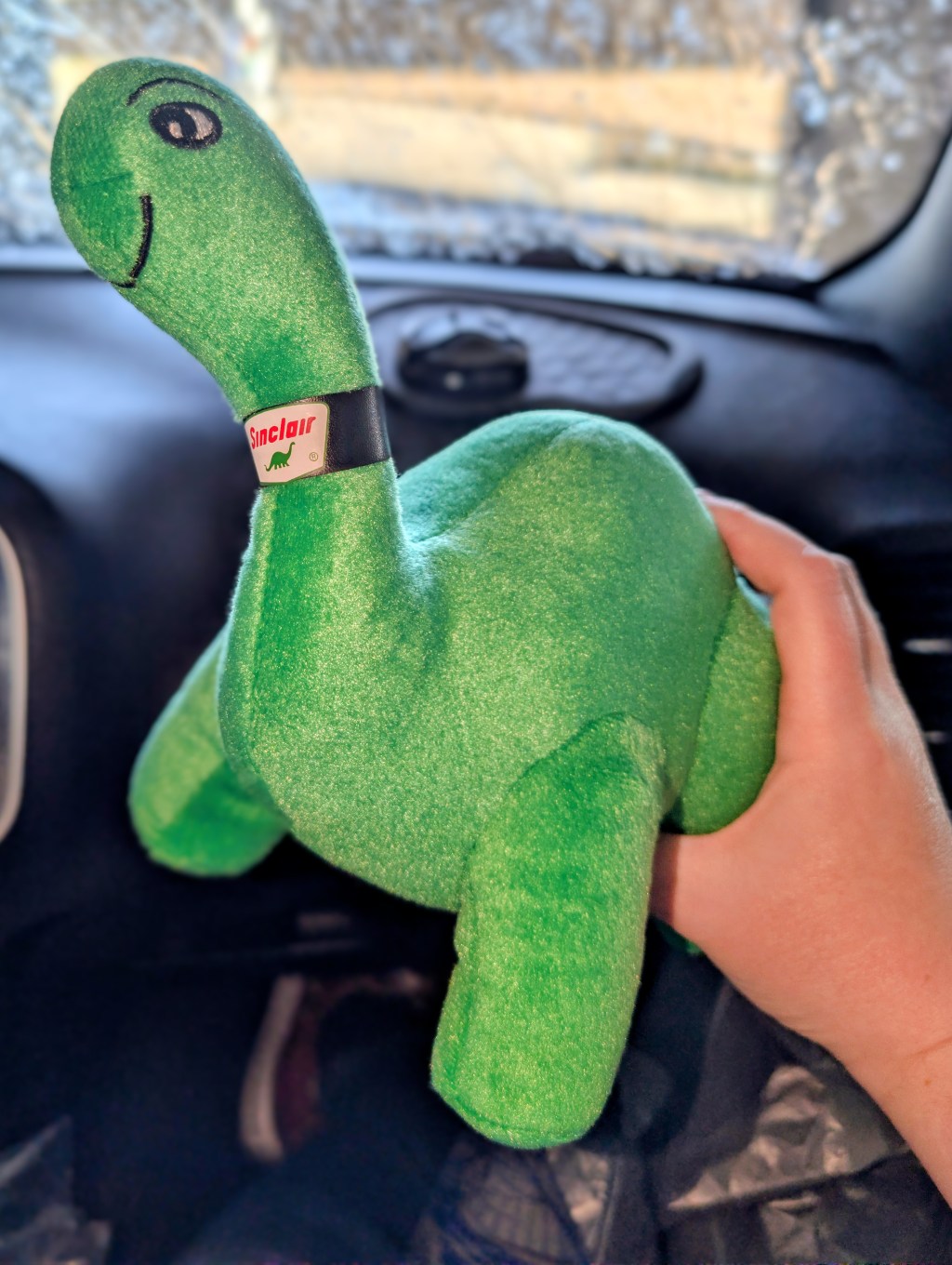 The absolute highlight of the day—and perhaps the most “me” moment of the trip—was finding a stuffed Sinclair dinosaur. For those who appreciate a bit of classic Americana and gas station kitsch, you know this was a major score. This green dino is the perfect mascot for the rest of our journey, and he’s already claimed a permanent spot in the car for the miles ahead.