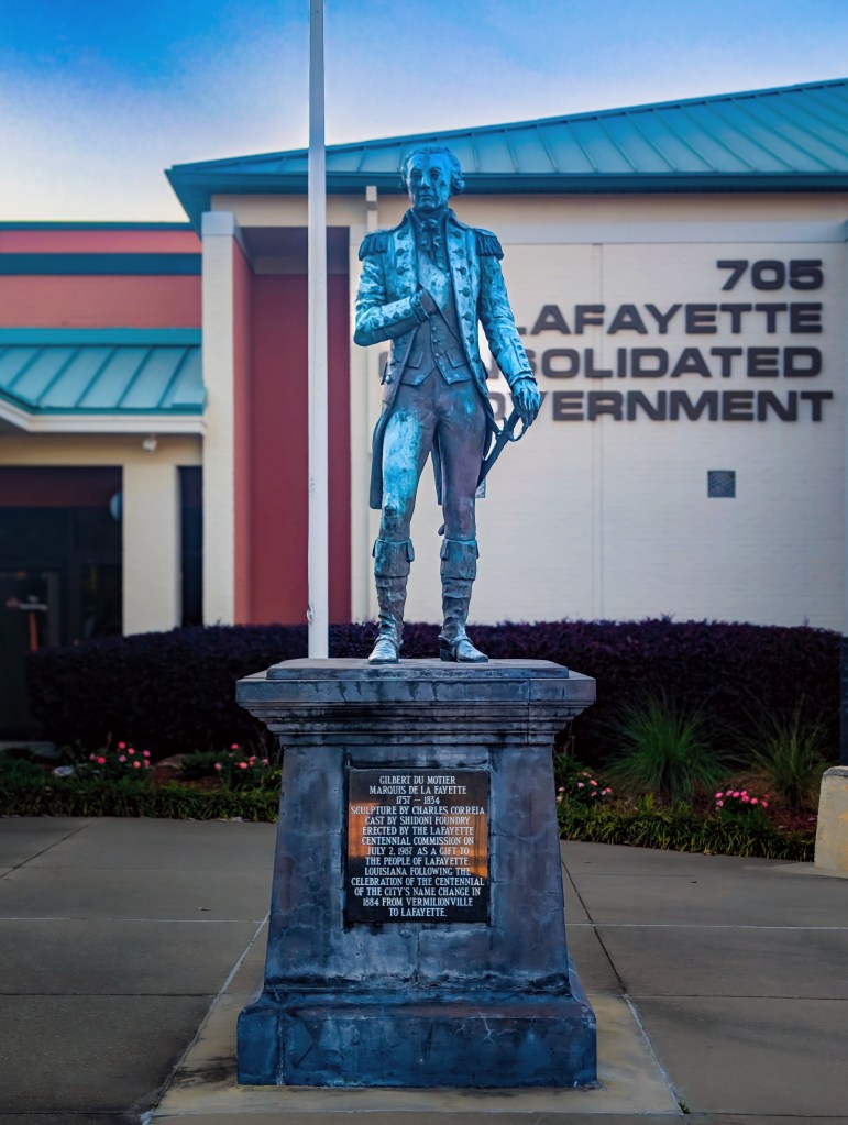 Before reaching the Big Easy, we made one final stop in Lafayette. Given my fascination with this period of history, we couldn’t pass through without visiting the statue of the city’s namesake: Marie-Joseph Paul Yves Roch Gilbert du Motier, Marquis de La Fayette. (What a name, right?) The statue is impressive, and it provided a great moment to stretch our legs and appreciate the French heritage that defines so much of this region.