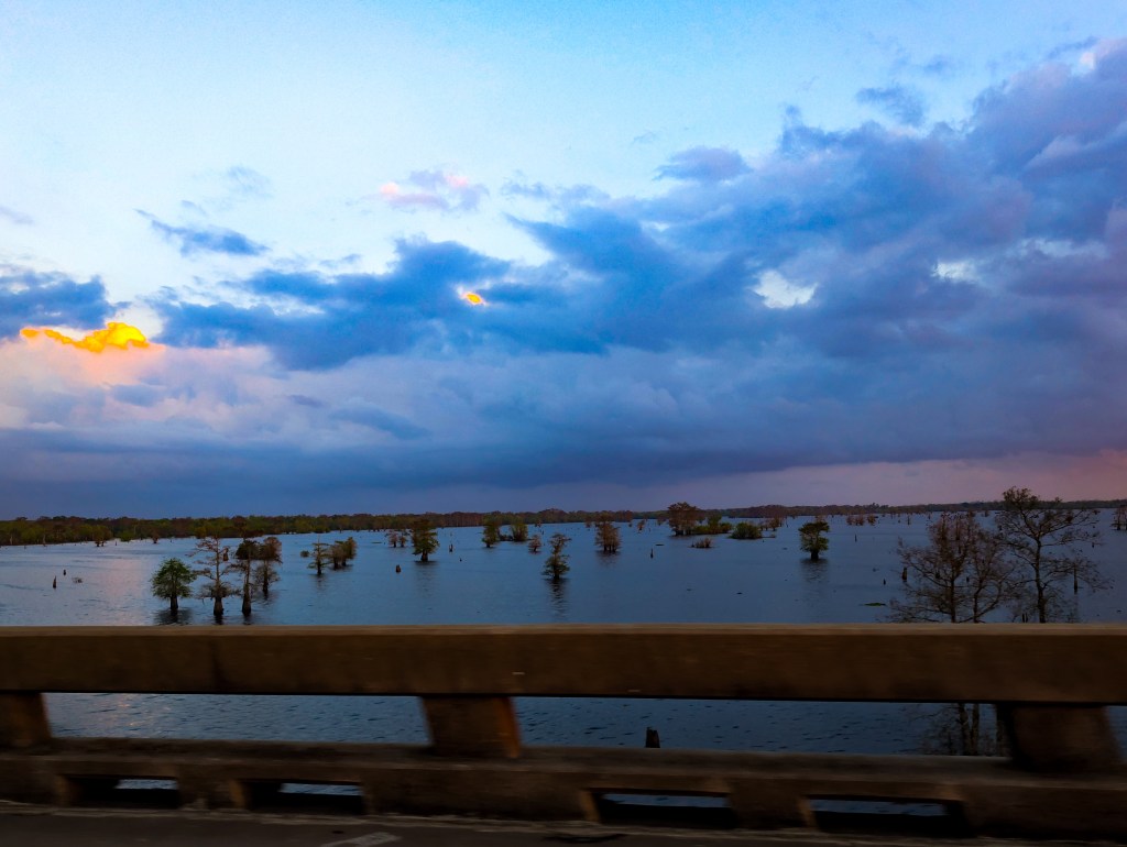 One of the highlights of the drive was crossing the Atchafalaya Basin Bridge. For a bridge lover like me, it was a dream. We hit the crossing right at sunset, so I snapped photos from the passenger window as the sun dipped below the bayou.