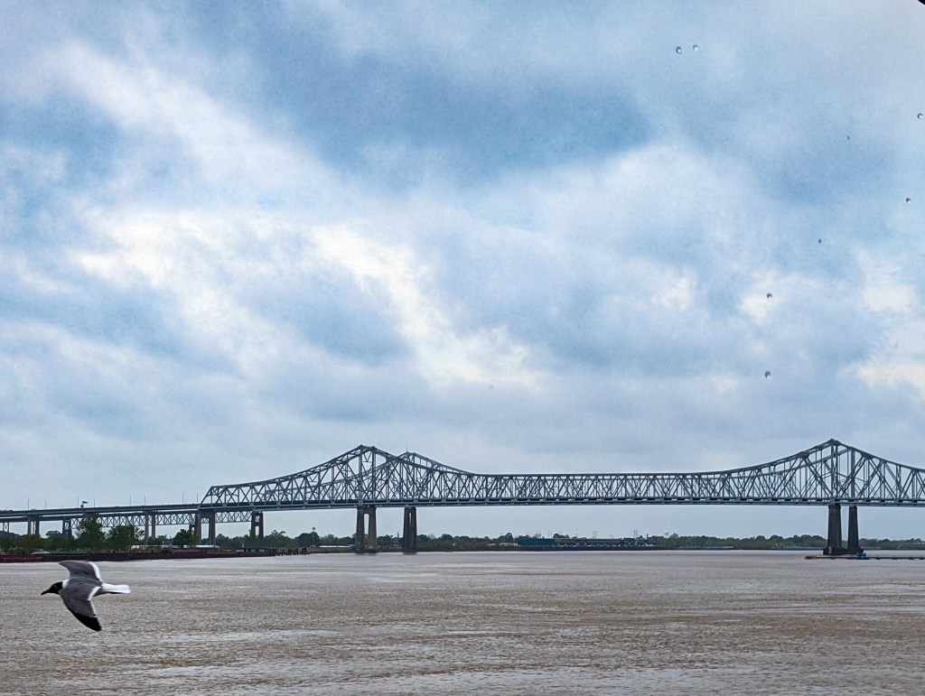 We enjoyed a three-course meal on board, and the breaded catfish was easily my favorite. Because it was a rainy day, we spent most of the cruise in the cabin sipping drinks—I opted for a Sunshine Spritz to counter the gloom—but we did venture onto the deck during a break in the rain to snag some photos. As a bridge lover, I couldn’t resist a shot of the river crossing (the bird in flight was a lucky bonus!).