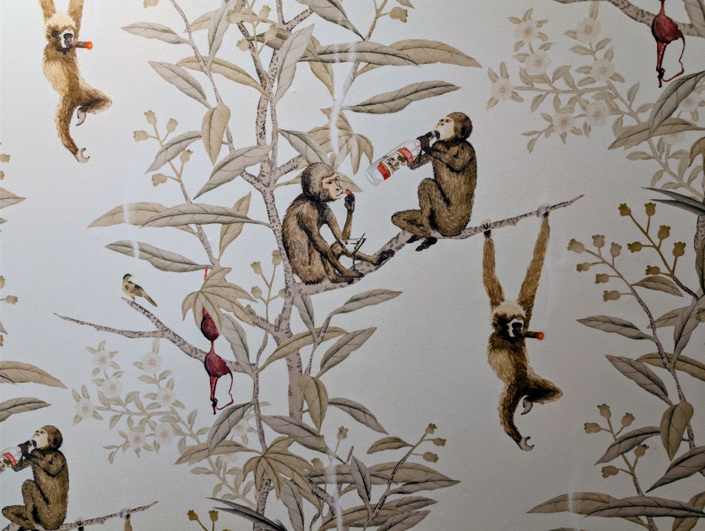 The thing that I didn’t expect, however, was a White Lotus-inspired wallpaper in the bathroom. It was complete with monkeys, bras, liquor, and cigars!