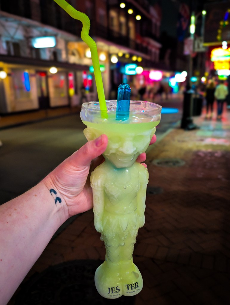 To wrap up the night, we did the quintessential NOLA move: grabbing a drink and strolling down Bourbon Street. There is nothing quite like the neon glow and the live music spilling out of every doorway. We picked up a few t-shirts, enjoyed our frosty drinks, and took in the “go-cup” culture.